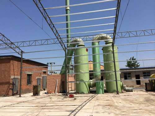 本裝置采用氫氧化鈉溶液為吸收中和液來(lái)凈化廢氣。氣體由離心通風(fēng)機(jī)壓入或吸入進(jìn)風(fēng)段,再向上流動(dòng),至第一級(jí)填料層,與第一級(jí)噴嘴噴出的中和液接觸反應(yīng)。吸收后的廢氣繼續(xù)向上流動(dòng)至第二級(jí)填料層,與第二級(jí)噴嘴噴出的中和液接觸,再次發(fā)生中和反應(yīng),根據(jù)廢氣各項(xiàng)指標(biāo),還可以加裝第三級(jí)填料及噴淋裝置,凈化達(dá)標(biāo)后的氣體通過(guò)除霧器排入大氣中。